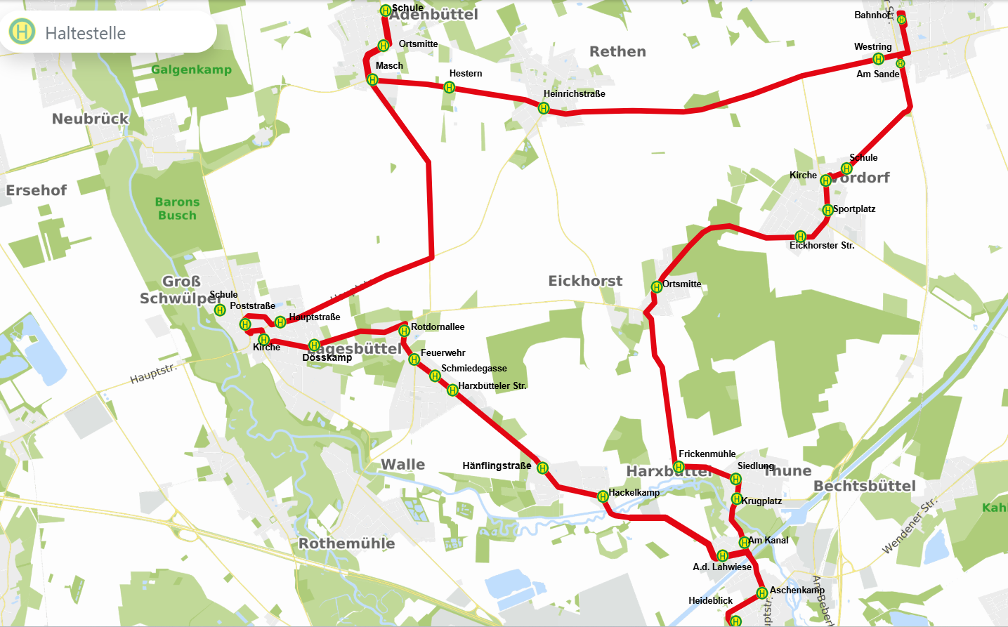 Wenden Heideblick – Thune – Eickhorst – Vordorf – Meine Bf – Rethen – Adenbüttel Masch – Groß Schwülper Hauptsr. – Poststr. – Lagesbüttel Harxbütteler Str. – Harxbüttel – Wenden Heideblick